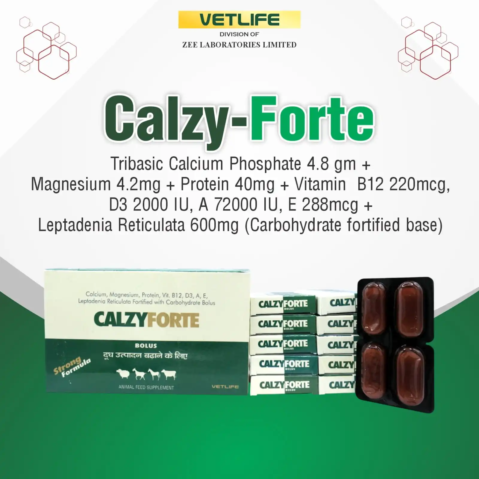 CALZY-FORTE Bolus is a balanced veterinary nutritional supplement formulated to support bone strength and overall productivity in livestock. It contains Tribasic Calcium Phosphate, essential vitamins, magnesium, protein hydrolysate, and Leptadenia reticulata, which help maintain optimal mineral balance and improve animal vitality.